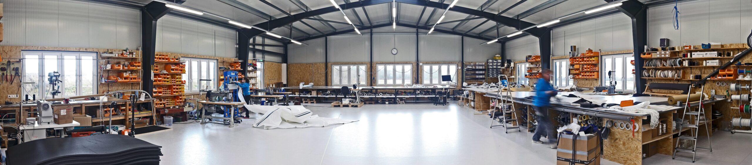 In unserer 2022 fertiggestellten Segelmacherei in Harrislee haben wir auf 450m² genügend Platz für die Fertigung und Reparatur großer Segel und Persenninge, sowie die Serienfertigung von textilen Produkten für unsere gewerblichen Kunden.